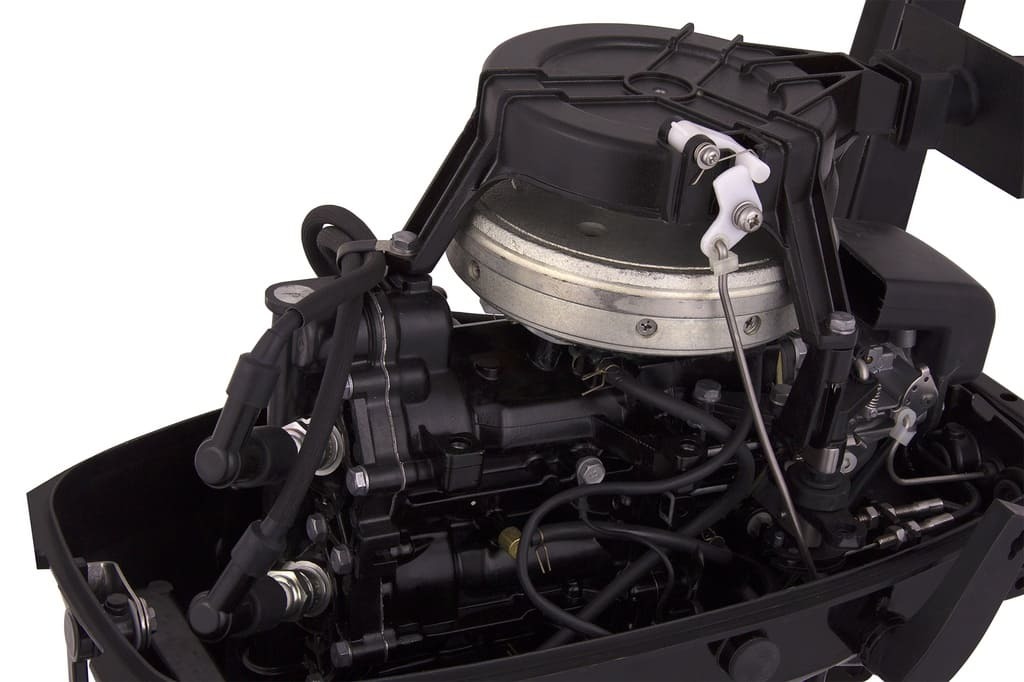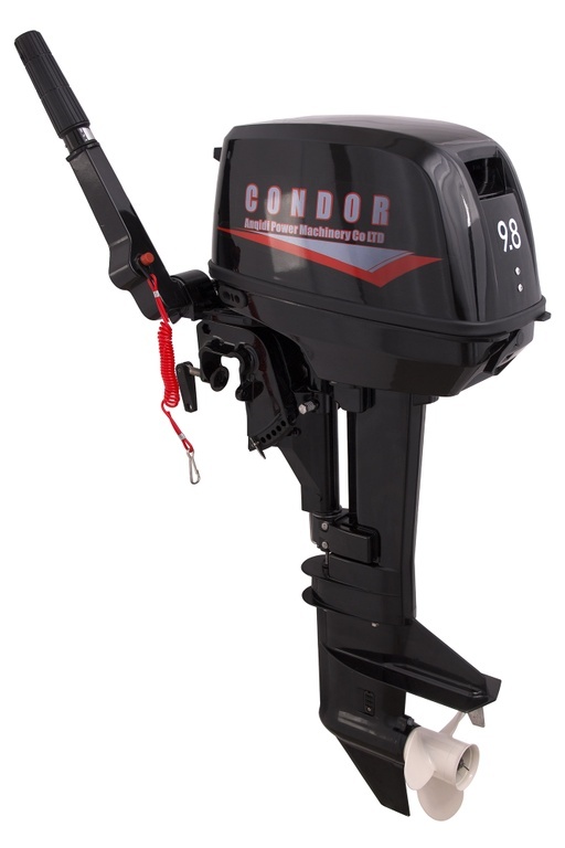 Двигатель Подвесной мотор CONDOR T9.8HS развивает мощность 9.8 л.с. при объеме 169 см3. Количество цилиндров – 2, диаметр цилиндра 50 мм, ход поршня 43 мм Максимальное число оборотов в минуту находится в пределах от 5000 до 6000. Двигатель имеет карбюраторную систему питания, система зажигания CDI. Смазка движущихся частей осуществляется предварительно смешанными бензином и маслом. Охлаждается мотор водой. Выхлопные газы удаляются через винт. Управление Двухтактный лодочный мотор CONDOR T9.8HS имеет румпельное управление (ручка газа на румпеле).