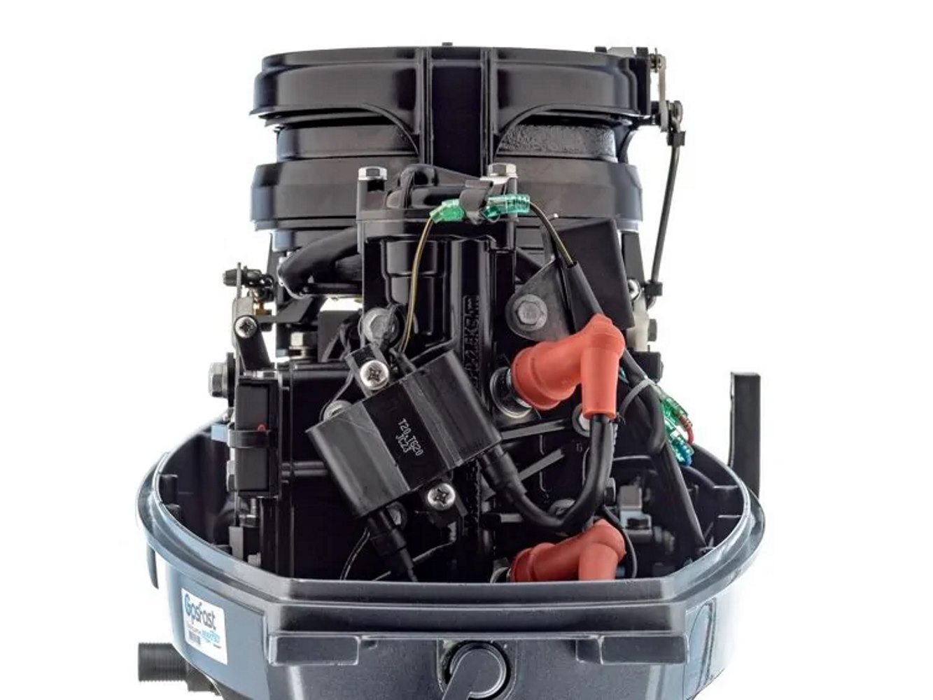 - Выпуск отработанных газов через ступицу винта обеспечивает тихую работу подвесного мотора.