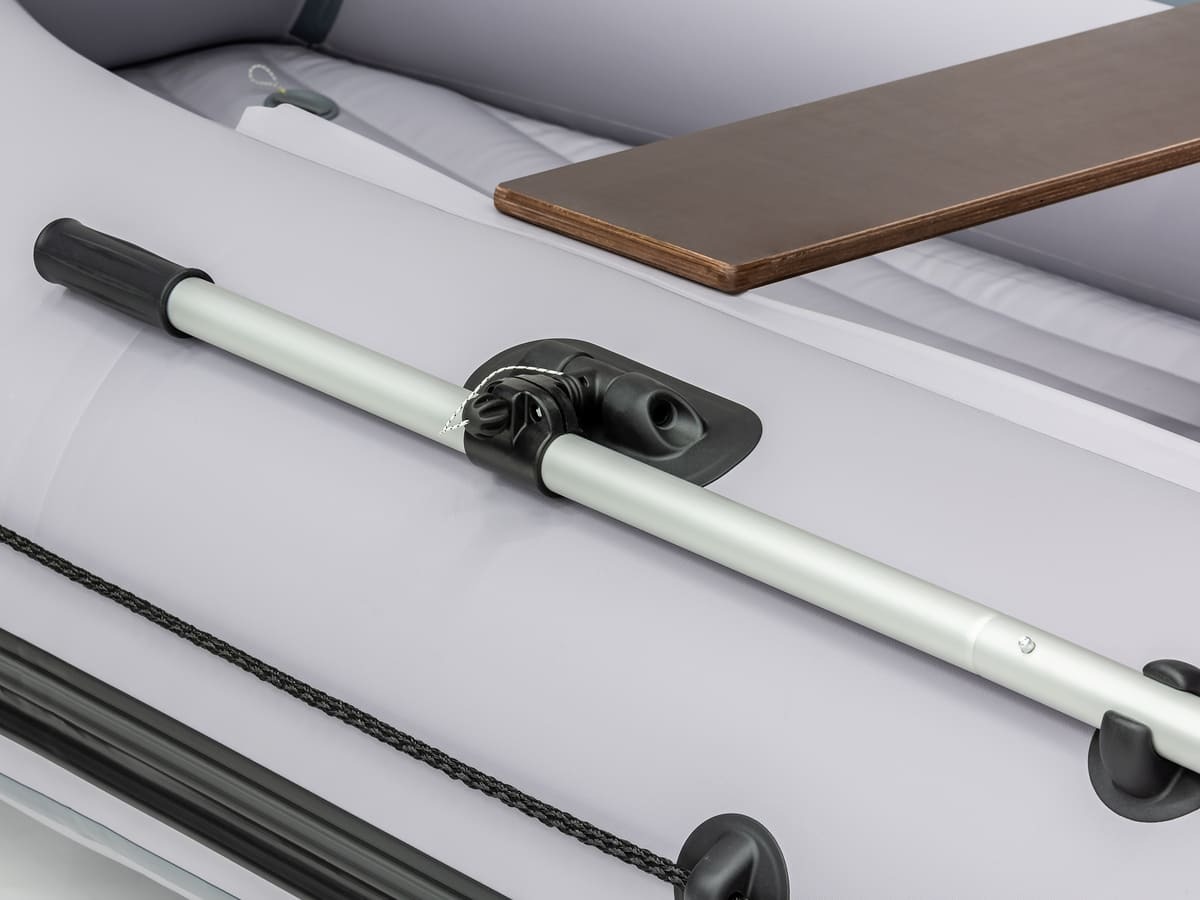 Отдельного внимания заслуживает фурнитура, которая используется на всей линейке Андромеда Air. Компания располагает собственной базой для литья пластмасс, укомплектованной австрийским и итальянским оборудованием. Фурнитура изготавливается на современном термопластавтомате. В производстве используются только высококачественные полимеры проверенных производителей. Ручки, шайбы, пластиковые элементы весла и поворотной уключины, фиксаторы сидений, держатели транца и концевики баллона разрабатывались специально для условий повышенных нагрузок, имеют хорошие показатели испытаний на разрыв и излом.