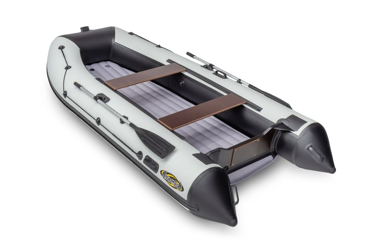 Лодка ПВХ Андромеда Air 360 — вторая по длине модель линейки. Отлично подойдёт для комфортной рыбалки 4 человек. Конструкция лодки выполнена в виде 3-секционного баллона, а отдельный надувной отсек значительно улучшает скоростные характеристики модели. Материал производства — высокопрочный ПВХ плотностью 1000 г/кв.м на баллонах и 1100 г/кв.м на днище. Материал с двусторонним полимерным покрытием, а также с добавлением термопластичного полиуретана. Это значит, что лодка готова к большим перепадам температур и спокойно выдержит рыбалку даже на 30-градусной жаре. Общая грузоподъёмность лодки составляет 650 кг, при собственном весе всего 40 кг. Для дополнительной безопасности модель оснащена подрывным и сливным клапанами, а оптимальная мощность мотора для Андромеда Air 360 составляет 18 л. с. Из интересных деталей можно отметить яркий контрастный дизайн модели, который делает её заметнее на воде.