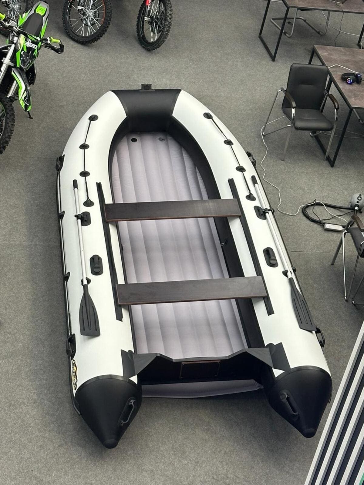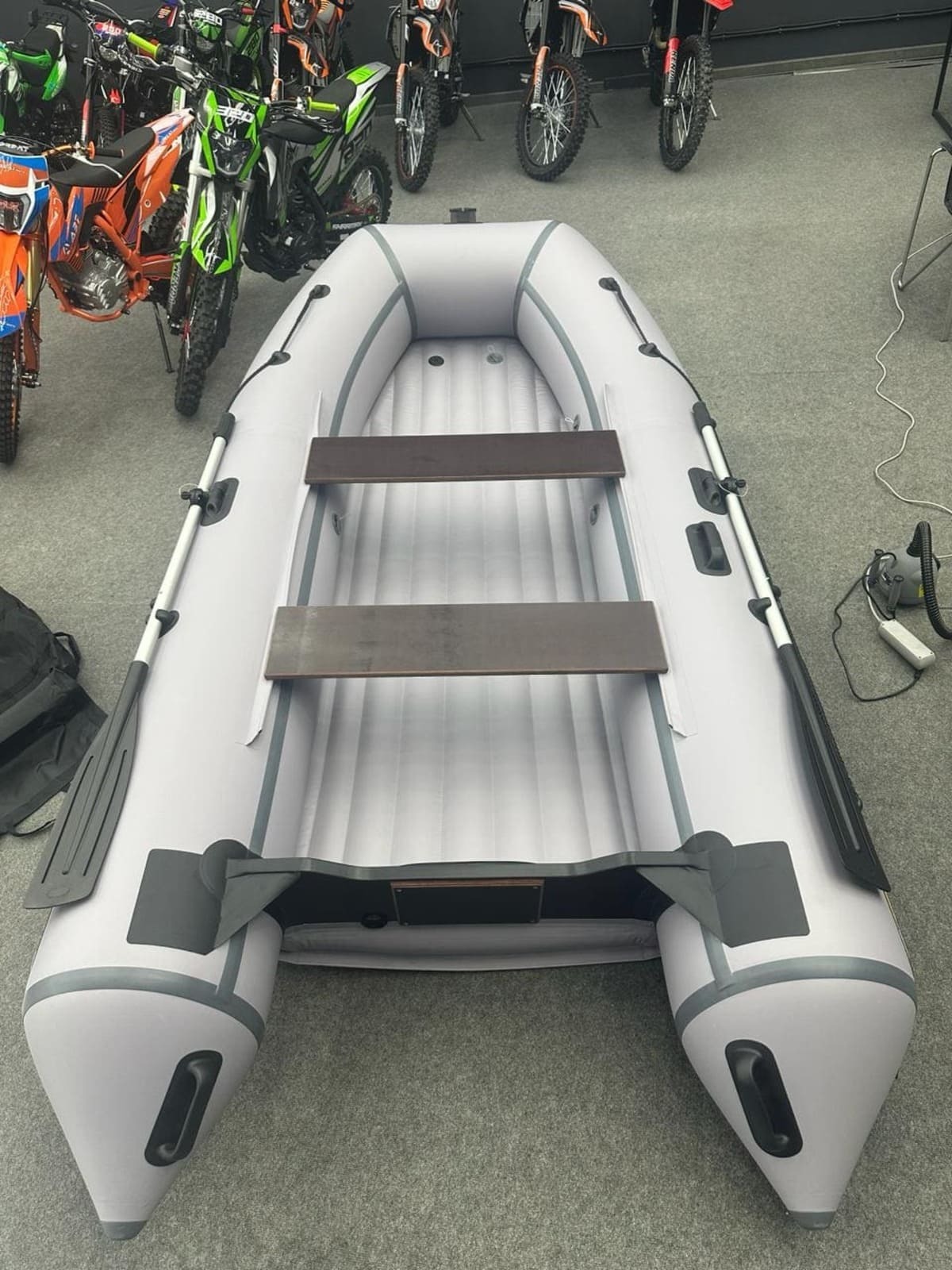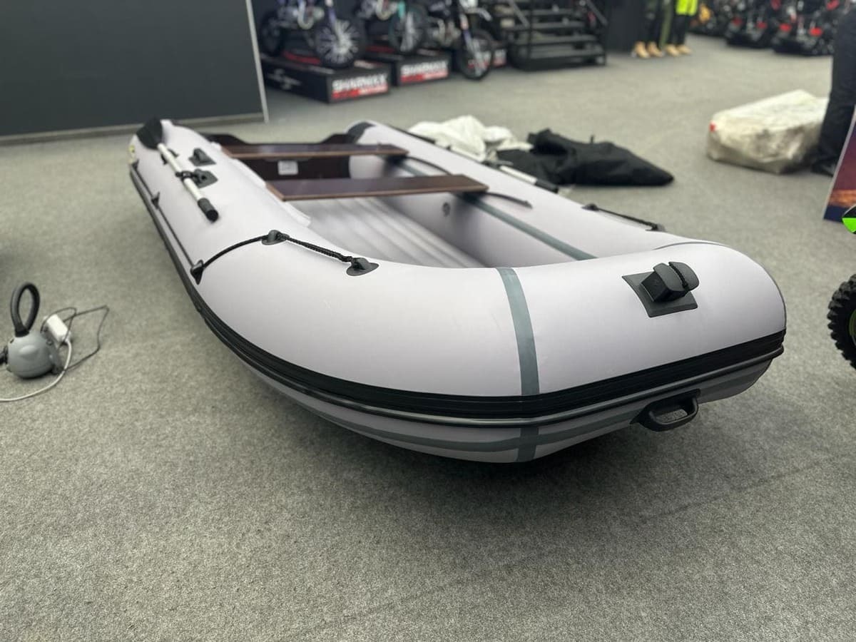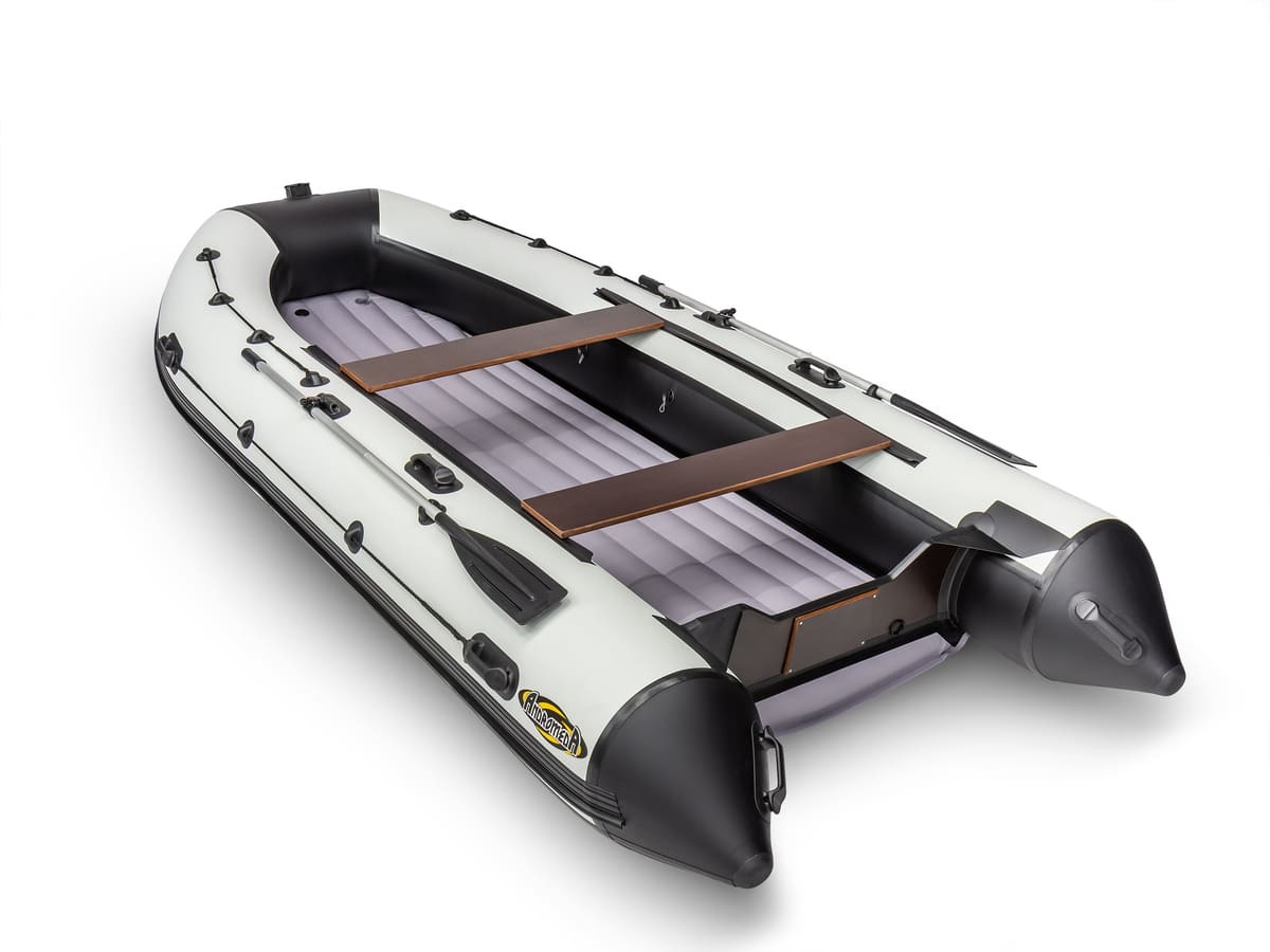 Лодка ПВХ Андромеда Air 430 — самая большая модель всей линейки Air. Идеально подойдёт для комфортной рыбалки 7 человек благодаря огромной площади кокпита (325 на 93 см). Конструкция лодки выполнена в виде 3-секционного баллона, а отдельный надувной отсек значительно улучшает скоростные характеристики модели. Материал производства — высокопрочный ПВХ плотностью 1000 г/кв.м на баллонах и 1100 г/кв.м на днище. Материал с двусторонним полимерным покрытием, а также с добавлением термопластичного полиуретана. Это значит, что лодка готова к большим перепадам температур и спокойно выдержит рыбалку даже на 30-градусной жаре. Общая грузоподъёмность лодки составляет рекордные 1100 кг, при собственном весе всего 54 кг. Для дополнительной безопасности модель оснащена подрывным и сливным клапанами, а оптимальная мощность мотора для Андромеда Air 430 составляет 30 л. с. но она “не откажется” и от 40 лошадок. Дизайн лодки — сдержанный минимализм в серо-белых тонах.