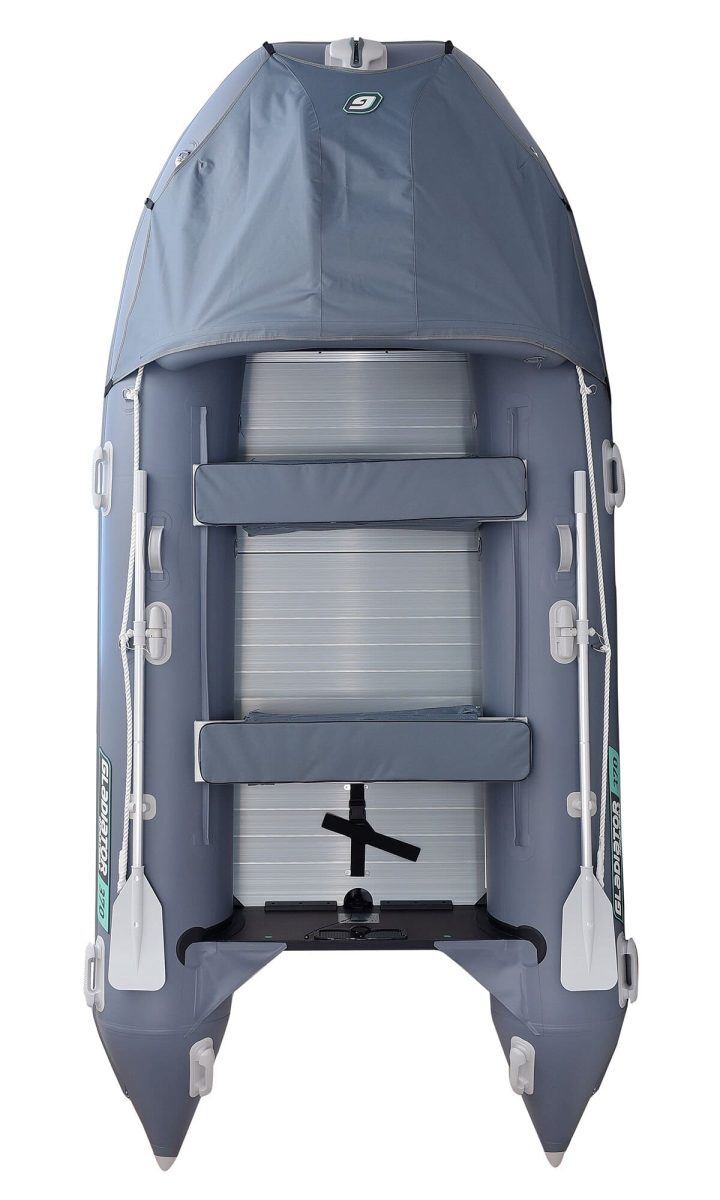 Лодка Гладиатор D370AL Professional ― пятиместная надувная лодка ПВХ повышенной прочности с жёстким поперечным транцем; надувным килем; сплошным алюминиевым полом со стрингерами; передвижными сиденьями; расширенной комплектацией.