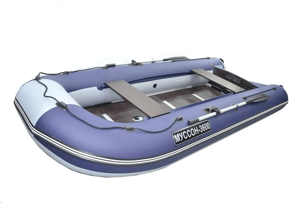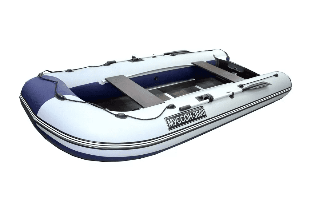 Все лодки моторные лодки Муссон выполнены из многослойной ткани ПВХ (германского производителя) плотностью 950-1000 г/м. Материал устойчив к проколам и порезам, не выгорает на солнце, остается эластичным на морозе, не преет и не гниет от тепла и сырости. Средний срок службы не менее 10 лет. Трущиеся части баллонов с низу усилены дополнительным слоем ПВХ материала, что также является плюсом для данной модели. Швы очень качественно проклеены. Муссон 3600 СК имеет классический фанерный пайол (слань), состоящий из щитов, которые соединяются закрепленными на них H и А-профилями. Сборка слани осуществляется путем стыковки Н и A профилей со стрингерами, что избавляет от проблемы «разбухшей фанеры», которая свойственна обычной системе соединения. Деревянный пол обеспечит комфорт босым ногам летом, и послужит теплоизолирующей прослойкой в прохладную погоду. Кроме того, настил делает корпус жестче, и дает возможность стоять или перемещаться по палубе.