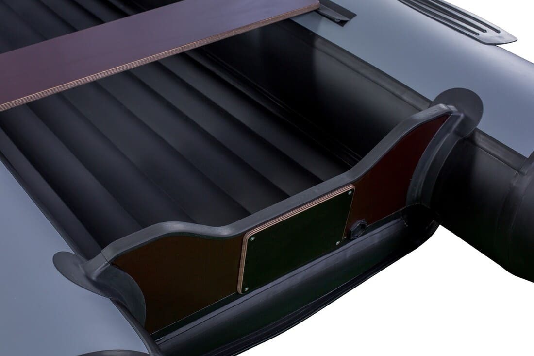 - Жёсткий встроенный транец из водонепроницаемой фанеры толщиной 24 мм. с двумя накладками — позволяет использовать подвесной мотор до 15 л.с. Транец оборудован сливным клапаном. Косынки из ПВХ между транцем и баллонами защищают кокпит от попадания брызг от мотора.
