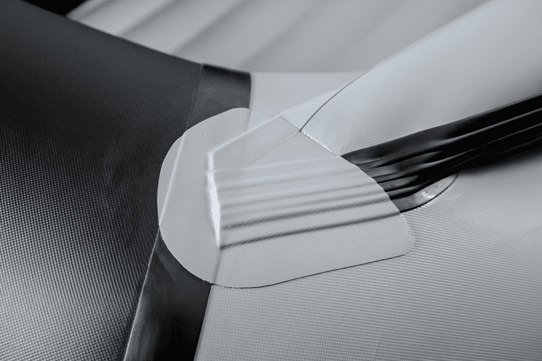 - Жёсткий встроенный транец из водонепроницаемой фанеры толщиной 24 мм. с двумя накладками — позволяет использовать подвесной мотор до 18 л.с. Транец оборудован сливным клапаном. Косынки из ПВХ между транцем и баллонами защищают кокпит от попадания брызг от мотора.