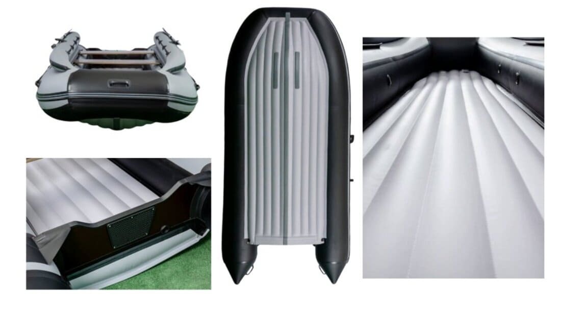 - Надувное дно низкого давления — НДНД. Лодка полностью готова к использованию за 20 минут работы ножной помпой (или до 10 минут — электрическим насосом). Надувное дно уменьшает осадку лодки и позволяет легко проходить пороги и мелководные участки. При движении надувное дно не прогибается, обеспечивая хорошую мореходность и смягчает (амортизирует) удары волн, повышая комфорт пассажиров. Являясь дополнительным воздушным отсеком, дно увеличивает грузоподъёмность и надёжность лодки.
