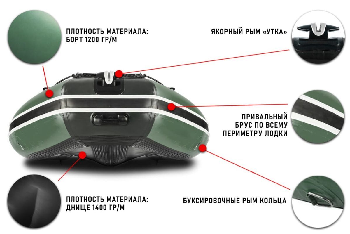 Также лодка оснащена всем необходимым для долгой, безупречной службы эксплуатации в даже при самых жестких условиях. Дополнительный комфорт данной модели лодки обеспечивается носовым тентом, а также удобной мягкой накладкой-сумкой на банку, внутренний отсек которой позволит сохранить от промокания самые ценные вещи. Стоит отметить наличие в данной комплектации лодки приспособлений для переноски и швартовки лодки. А усиленный транец из бакелитовой фанеры позволит использовать мотор большей мощности по сравнению с аналогичными моделями лодок.