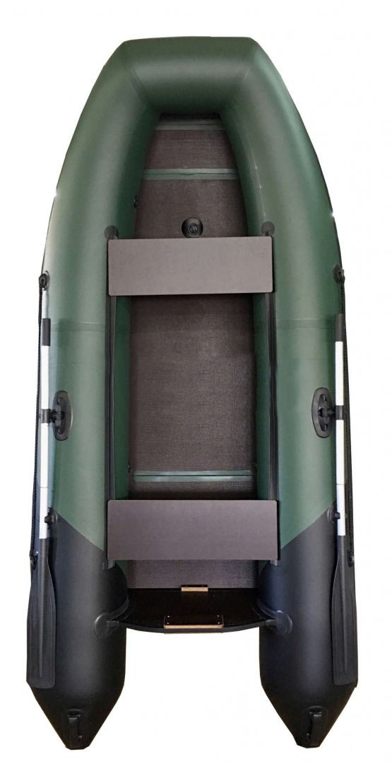 Надувная моторная лодка Камыш 3200 Легкая серия с Л-образным корпусом, разделенным внутренними перегородками на три автономных отсека и вклеенным жестким транцем. К корпусу лодки приклеено килеватое тканевое днище с надувным килем. Транец не килеватый. На борта лодки приклеены поворотные уключины, фиксаторы весел, причальная шайба, шайбы леера и пояса для крепления подвижных сидений и три формовые ручки для переноски лодки. На борт лодки приклеен плоский привальный брус.