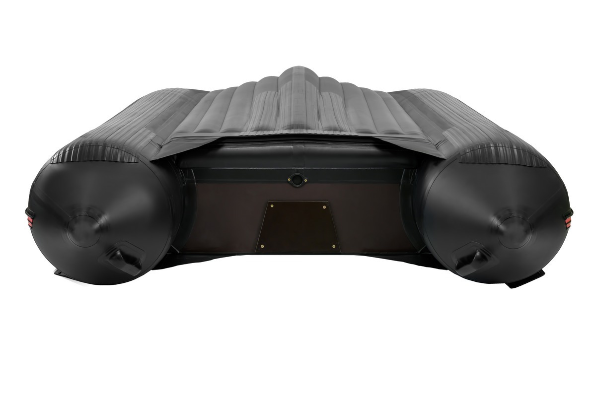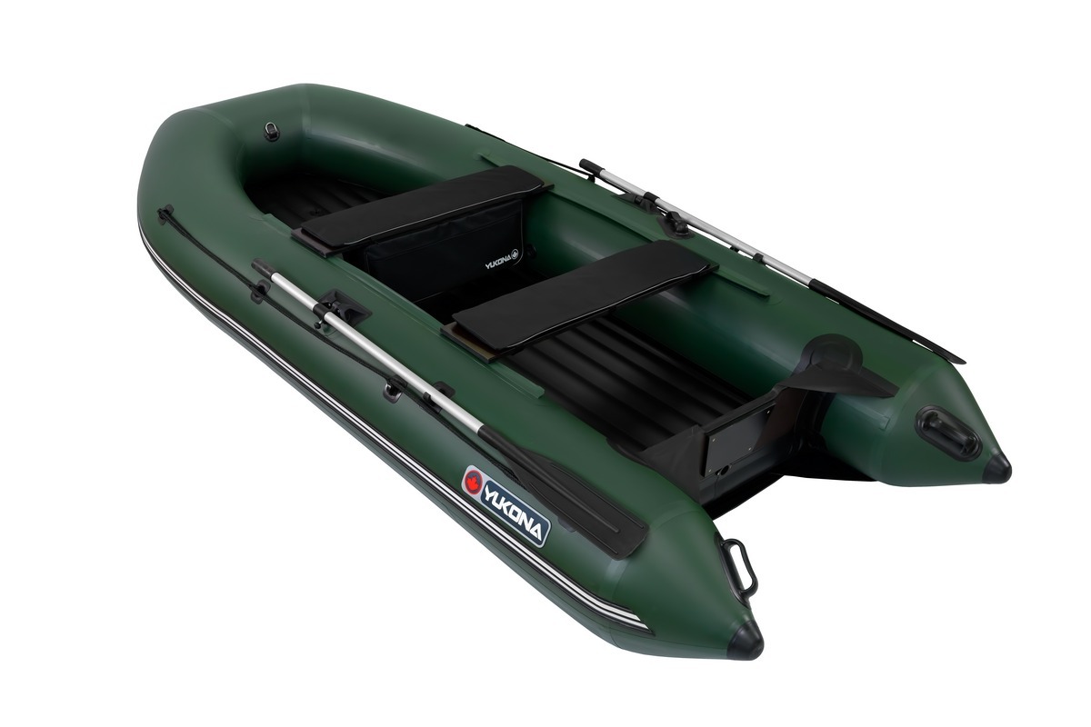 Надувное V-образное дно моторных лодок Юкона серии НДНД образованное комплектом продольных переборок и вклеенная в корпус надувной лодки, обеспечивает необходимую жесткость днища и минимальное гидродинамическое сопротивление, высокие скоростные характеристики. Это позволяют моторным лодкам быстро выходить на глиссирование с лодочным мотором мощность от 10 л.с.