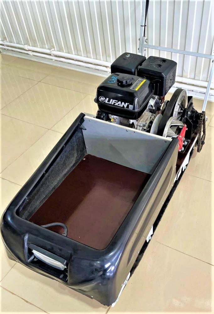 Мотособака оснащена 4-х тактным двигателем Lifan мощностью 15 л. с., что позволяет достигать скорости до 45 км/ч. Это позволяет быстро перевозить общий груз до 300 кг в санях. Объем двигателя составляет 420 кубов.