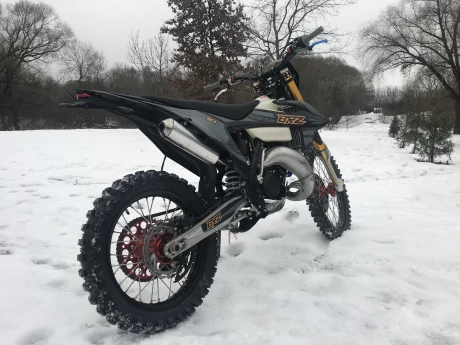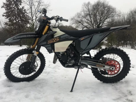 Установлены усиленные японские диски (железные и фрикционные) от японского бренда F.C.C. Также применена крышка сцепления со встроенной дополнительной форсункой, через которую подается масло и дополнительно охолождает и смазывает пакет дисков. Эта система продляет срок службы сцепления, дает возможность преодолевать сложные препятствия, где нужно «травить» сцеплением. Для облегчения выжима применены специальные тросы с уменьшенным трением за счет специальной полиуретановой оболочки стального троса, а также специальный переходной кронштейн легкого выжима. Радиатор Радиаторы системы охолождения надежно защищены алюминиевой рамкой с распорными втулками. На правом радиаторе в базе установлен вентилятор, также упакованный в алюминиевую защиту, чтобы в критический момент он не вышел из строя. Резиновые шланги были заменены на силиконовые, они лучше справляются с температурой и не высыхают со временем. Шасси Рама Все полноразмерные модели BRZ построены на новой раме K8. Она сделана по подобию рамы KTM 2017-2022 года. Благодаря стальной легкой раме мотоцикл получил правильную развесовку, он лучше рулится в поворотах и более стабилен на больших скоростях. С передней части рамы установлена алюминиевая защита двигателя. Подрамник Подрамник выполнен из алюминия. Легкий и прочный, в отличии от пластикового, выдерживает падения или нежелательного сальто, его можно выправить в случае деформации. Маятник В паре с новой рамой используется новый маятник.