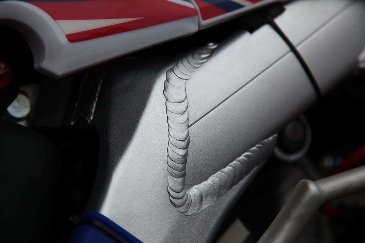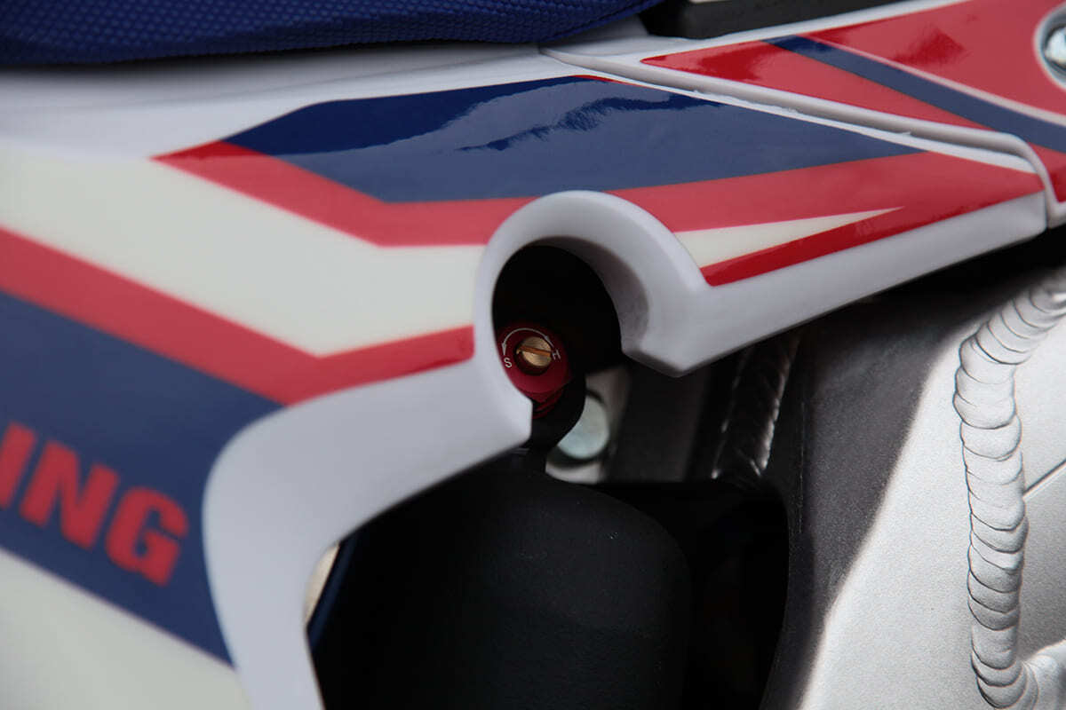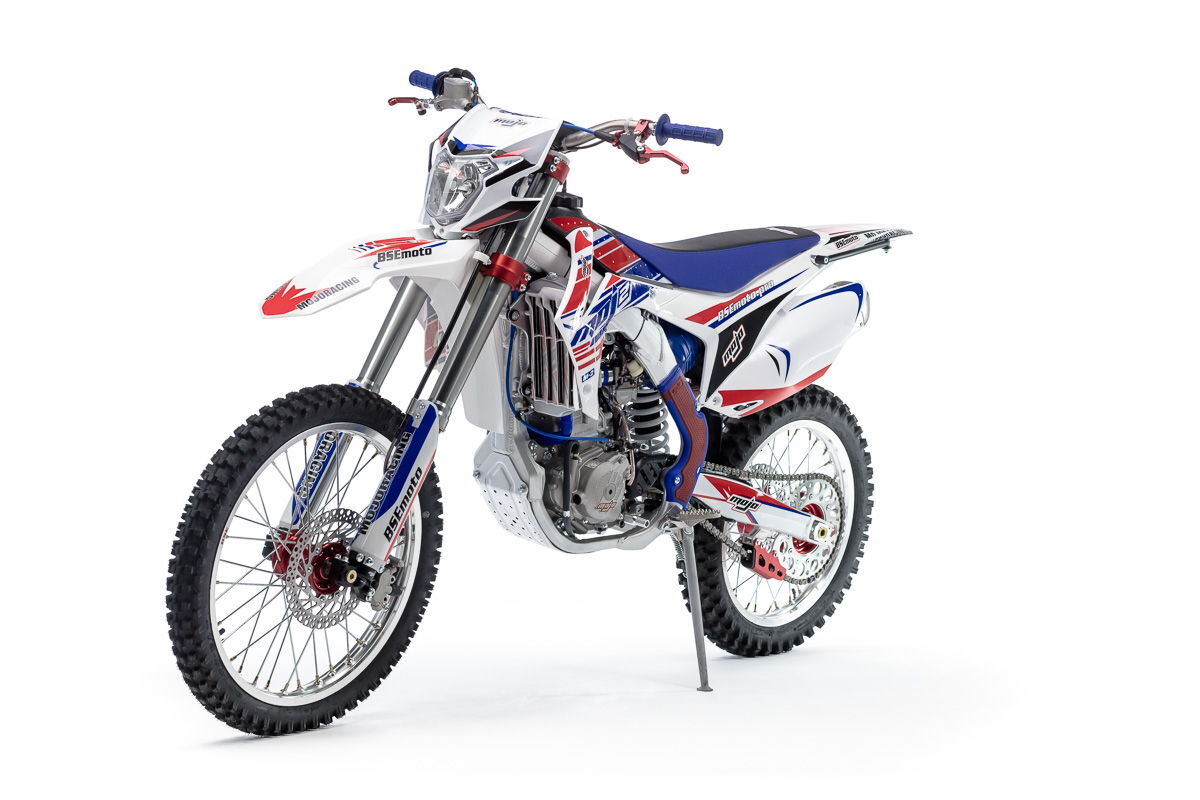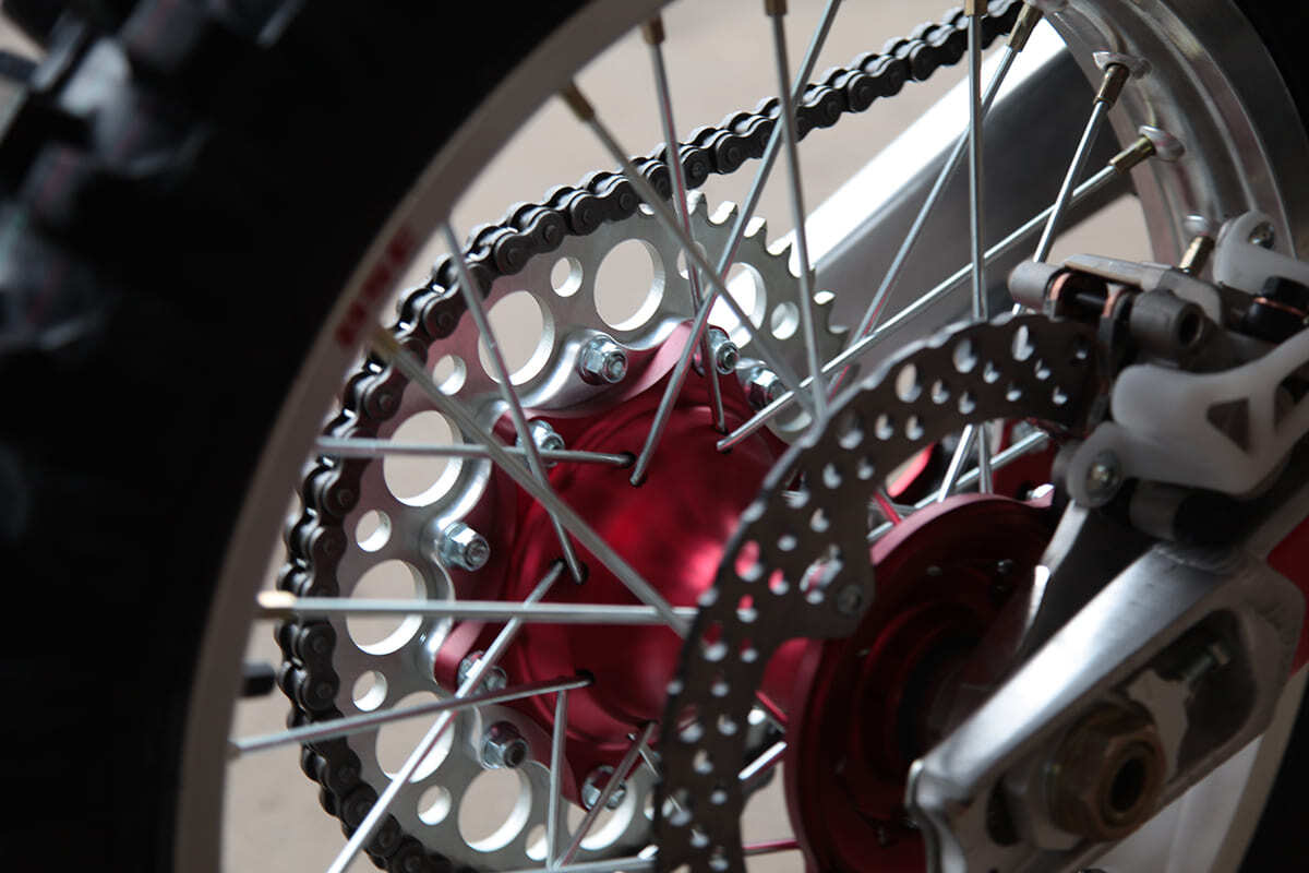 На мотоцикле установлено все необходимое для оффроуда: вилка “перевертыш”, литые рычаги задней прогрессии, алюминиевый маятник, прочный задний бугель, “злая” внедорожная резина Kenda. А также: усиленные легкосплавные колёсные диски MOJO, усиленная цепь, защита рук, датчик моточасов, прочные анодированные CNC ступицы, складные СNC рычаги тормоза и сцепления, колесные подшипники NTN, защита коллектора, днища и тормозных дисков. Комплектуется одинарным либо двойным глушителем. Мощная гидравлическая тормозная система HSК Racing остановит байк в любых условиях.