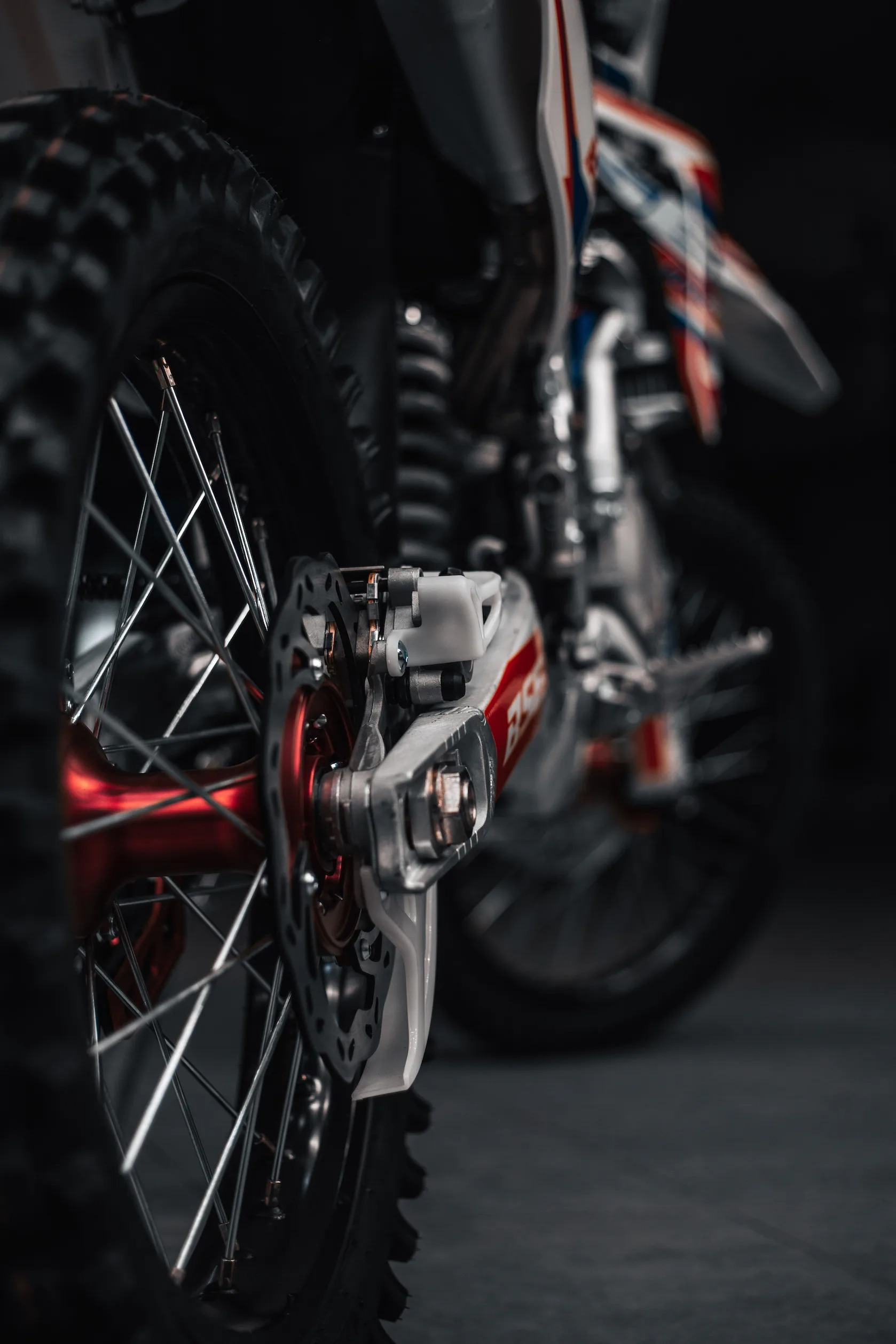 На мотоцикле установлено все необходимое для оффроуда: вилка “перевертыш”, литые рычаги задней прогрессии, алюминиевый маятник, прочный задний бугель, “злая” внедорожная резина. А также: усиленные легкосплавные колёсные диски MOJO, усиленная цепь, защита рук, датчик моточасов, прочные анодированные CNC ступицы, складные СNC рычаги тормоза и сцепления, колесные подшипники NTN, защита коллектора, картера двигателя и тормозных дисков. Комплектуется одинарным либо двойным глушителем. Мощная гидравлическая тормозная система HSК Racing остановит байк в любых условиях.