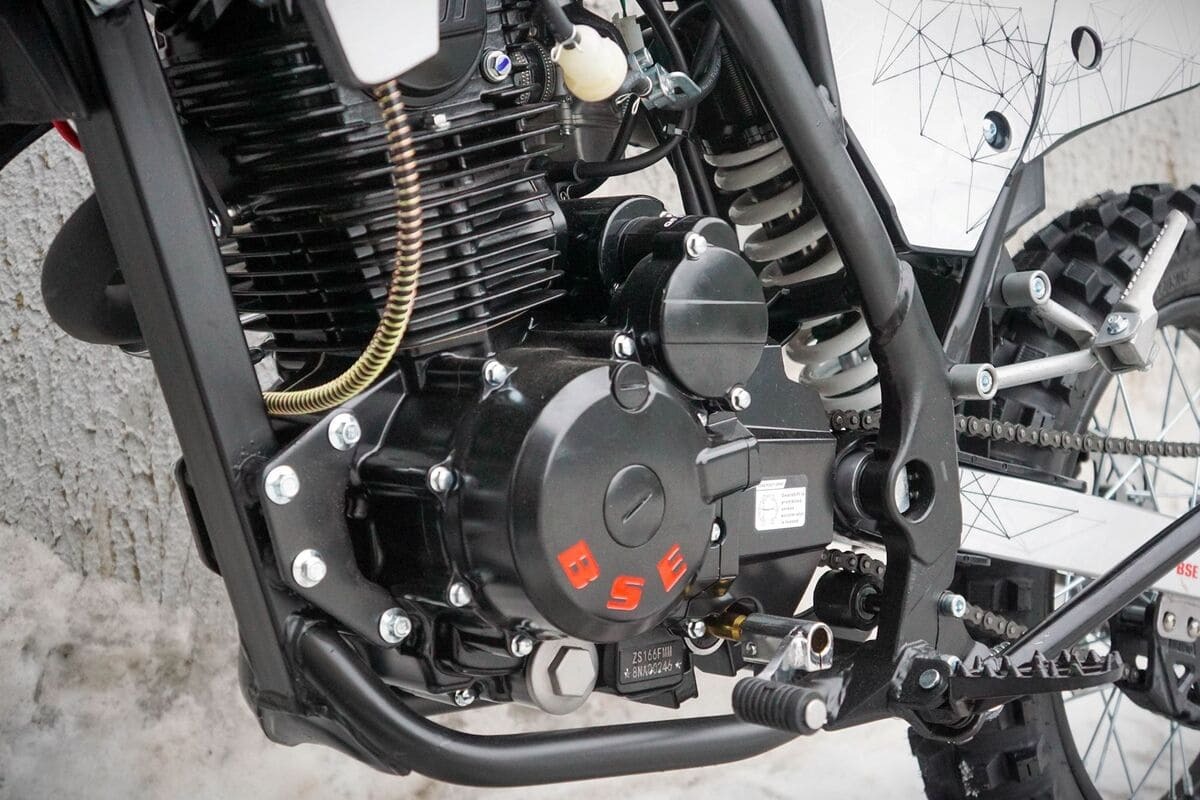 Двигатель установлен проверенный – Zongshen ZS 161 мощностью 12 л.с. У него отличная тяга с низов, поэтому на мотоцикле легко ехать по бездорожью даже с минимальным опытом вождения. Для безопасности при спуске со склонов и в других опасных ситуациях предусмотрены надежные гидравлические тормоза бренда HSK Racing. С завода на байке есть все необходимое для езды по городу: комплект светотехники, поворотники, крепление номера и зеркала заднего вида. А более заметной на дороге модель делает расцветка Road Iceberg со световозвращающей пленкой.