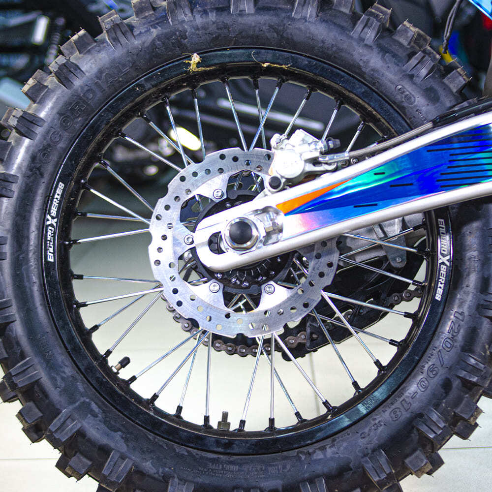 Мотоцикл оснащён классическими спицованными колёсами диаметром 18 и 21 дюйм. Эффективное и безопасное замедление с любых скоростей обеспечивают гидравлические дисковые тормоза – спереди установлен 2-поршневой суппорт SZC и тормозной диск диаметром 260 мм, а сзади – однопоршневой суппорт SZC с диском диаметром 220 мм. Мотоцикл достаточно компактен и имеет вес всего 116 кг. Топливный бак вмещает 8 литров горючего. Модель укомплектована яркой фарой, которая позволяет кататься в тёмное время суток.