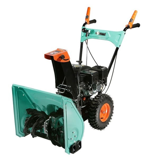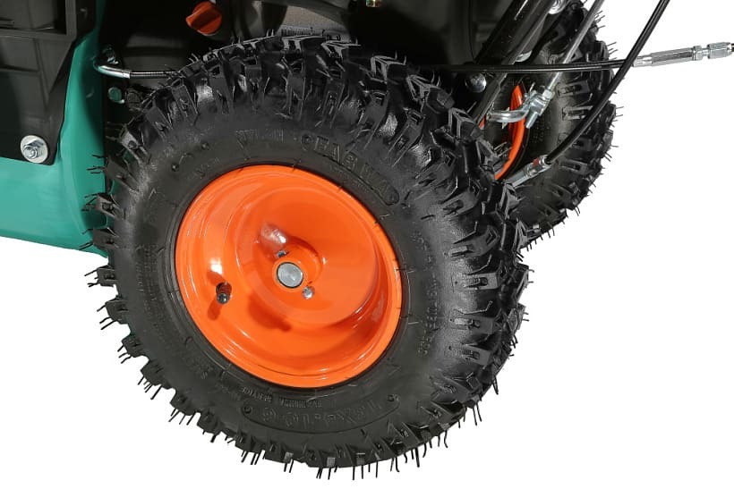 Высокая производительность машины обеспечивается не только мощным двигателем, но и продуманной конструкцией забора снега — этому способствует использование мощных агрессивных шнеков с большим профилем зуба, позволяющих легко справляться даже со слежавшимся снегом и настом, а также вместительного снегозагребного ковша, гарантирующего внушительную ширину прохода и возможность убирать сугробы до полуметра высотой. Снегоуборщик оснащен выпускным желобом, с регулировкой как по направлению, так и углу выброса, благодаря чему пользователь без труда может настроить оптимальное расстояние, на которое будет отбрасываться снежная масса. Максимальная дальность выброса достигает 11 метров. Для лучшего сцепления с поверхностью модель комплектуется специальными шинами с глубоким протектором.